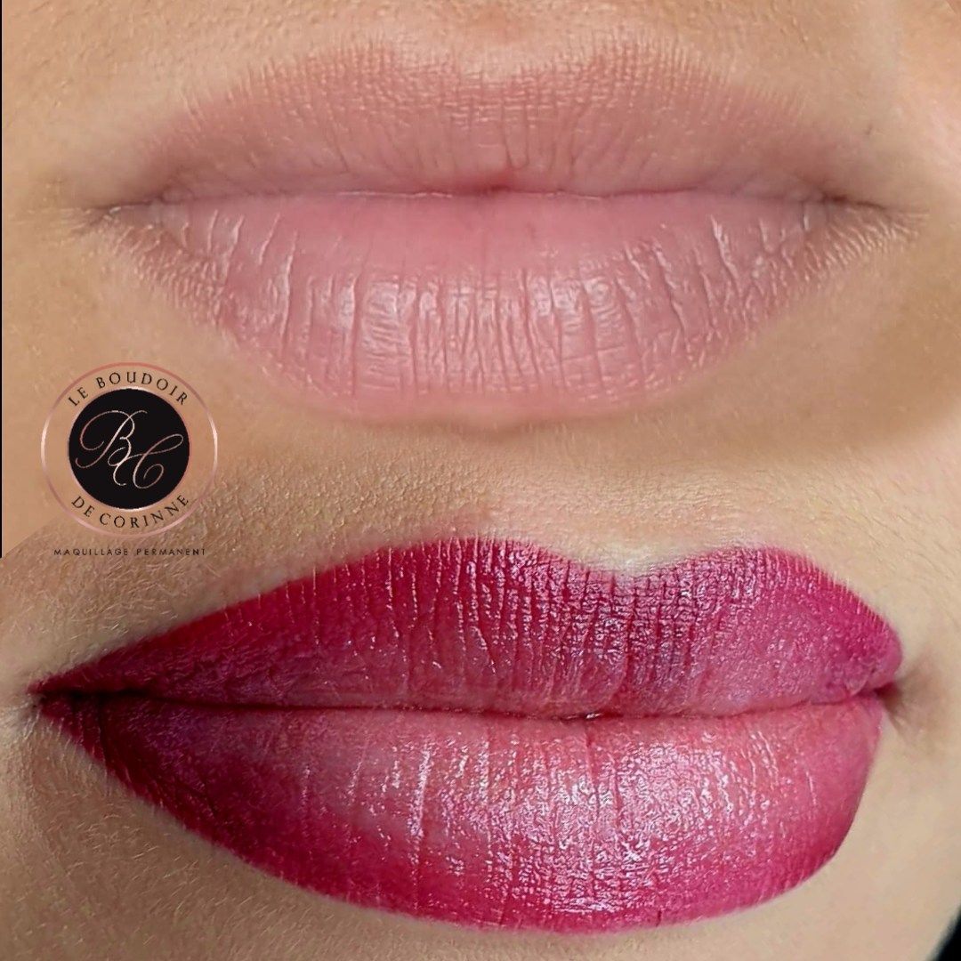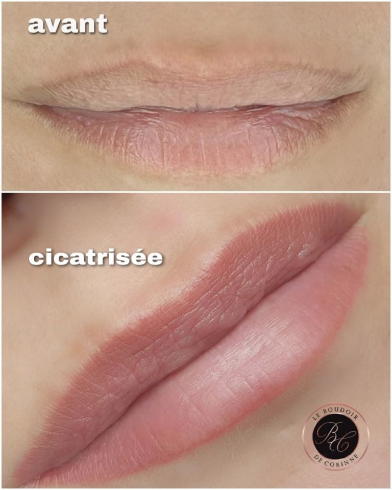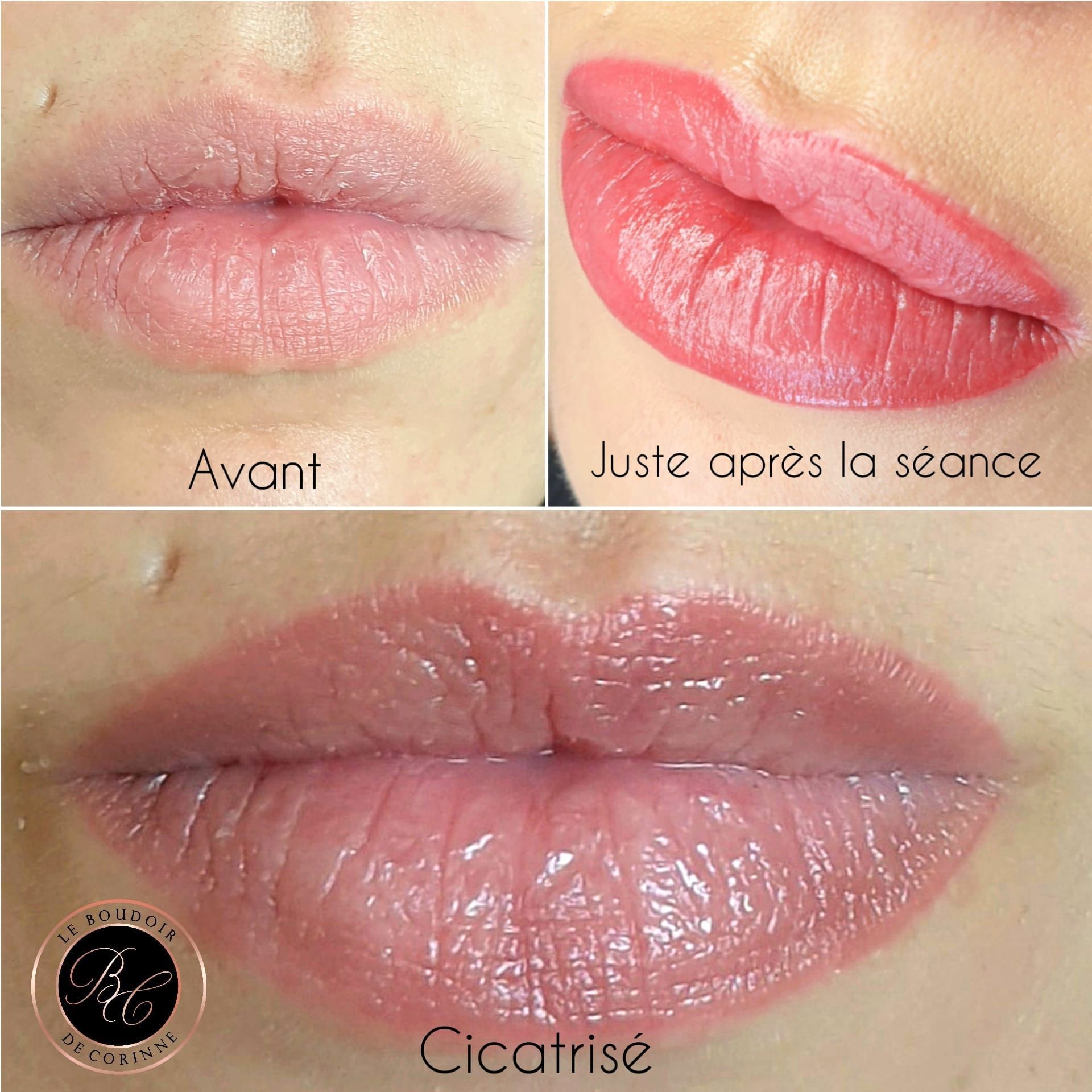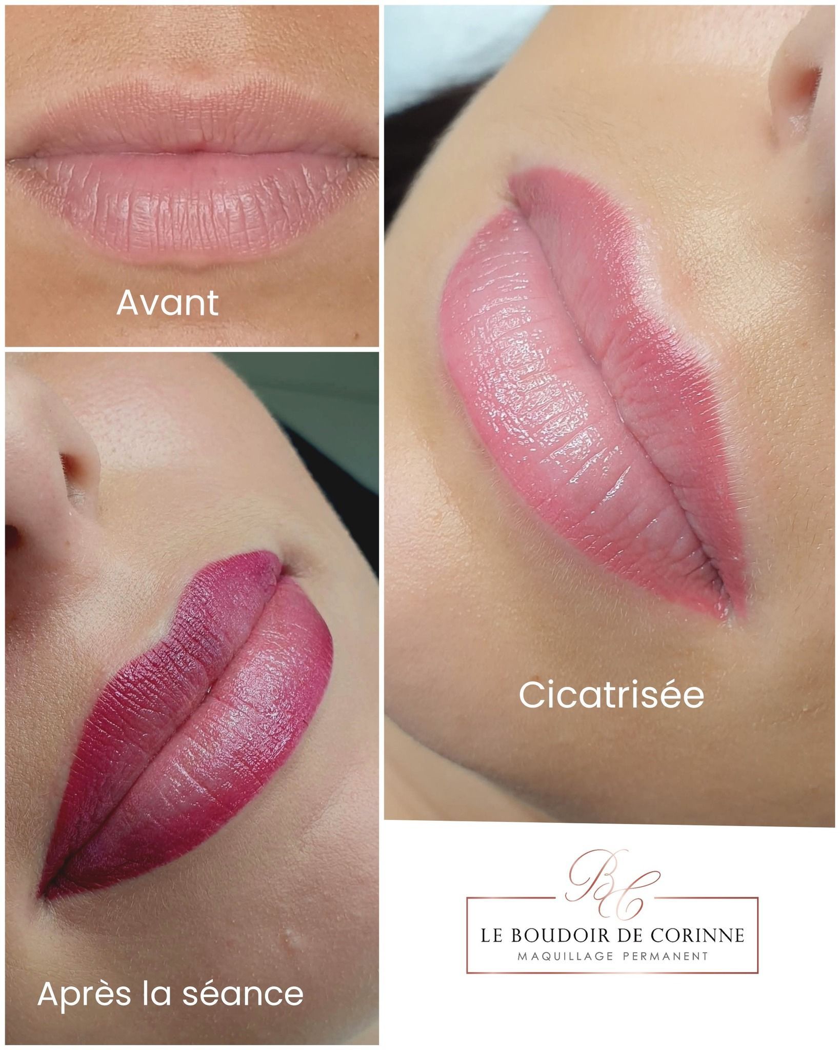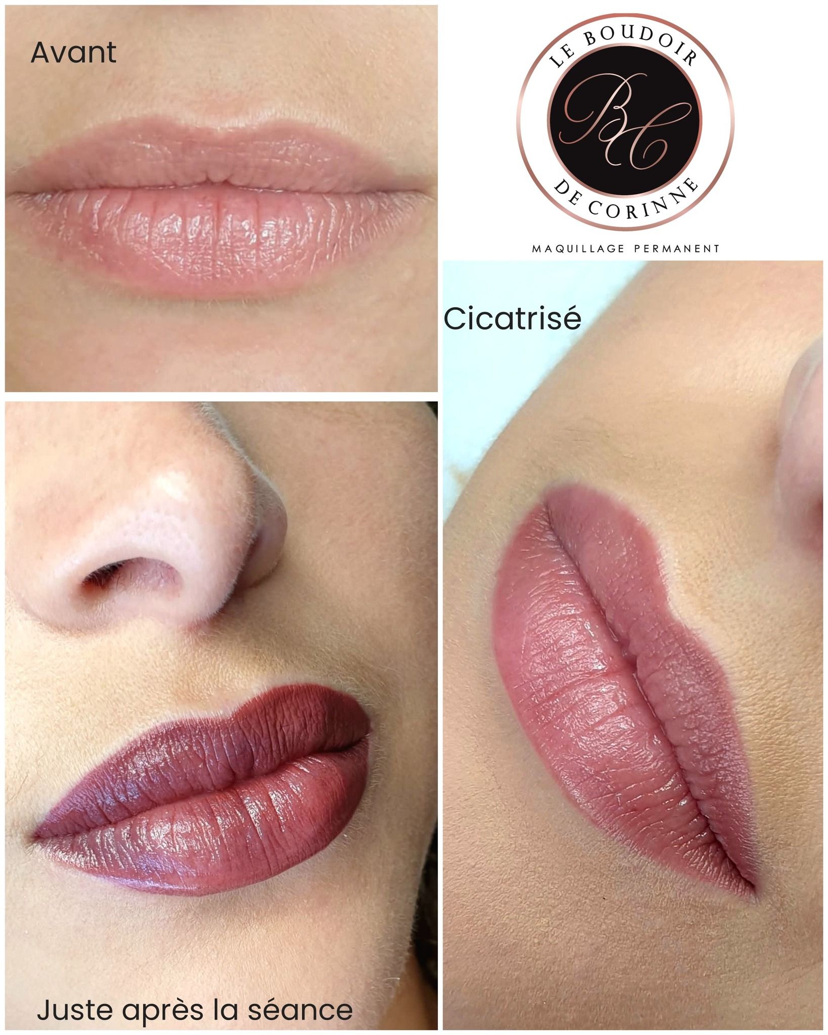 Une fois la séance terminée, les lèvres sont plus ou moins gonflées, et très pigmentées. Le pigment va s'atténuer d'environ 40 % les jours qui suivent. Il faut attendre environ 5 semaines pour voir le rendu. Afin d'optimiser votre dermo pigmentation, une deuxième séance, (offerte) pourra être effectuée 5 à 6 semaines après, si besoin.