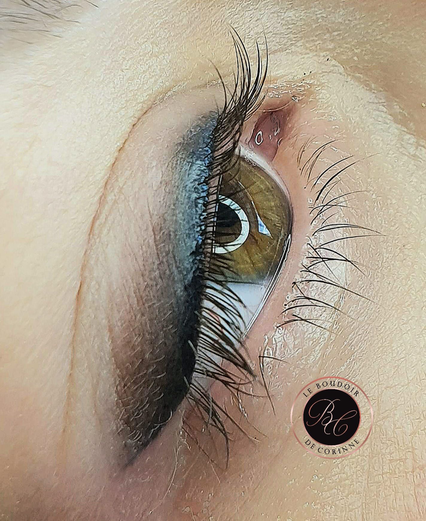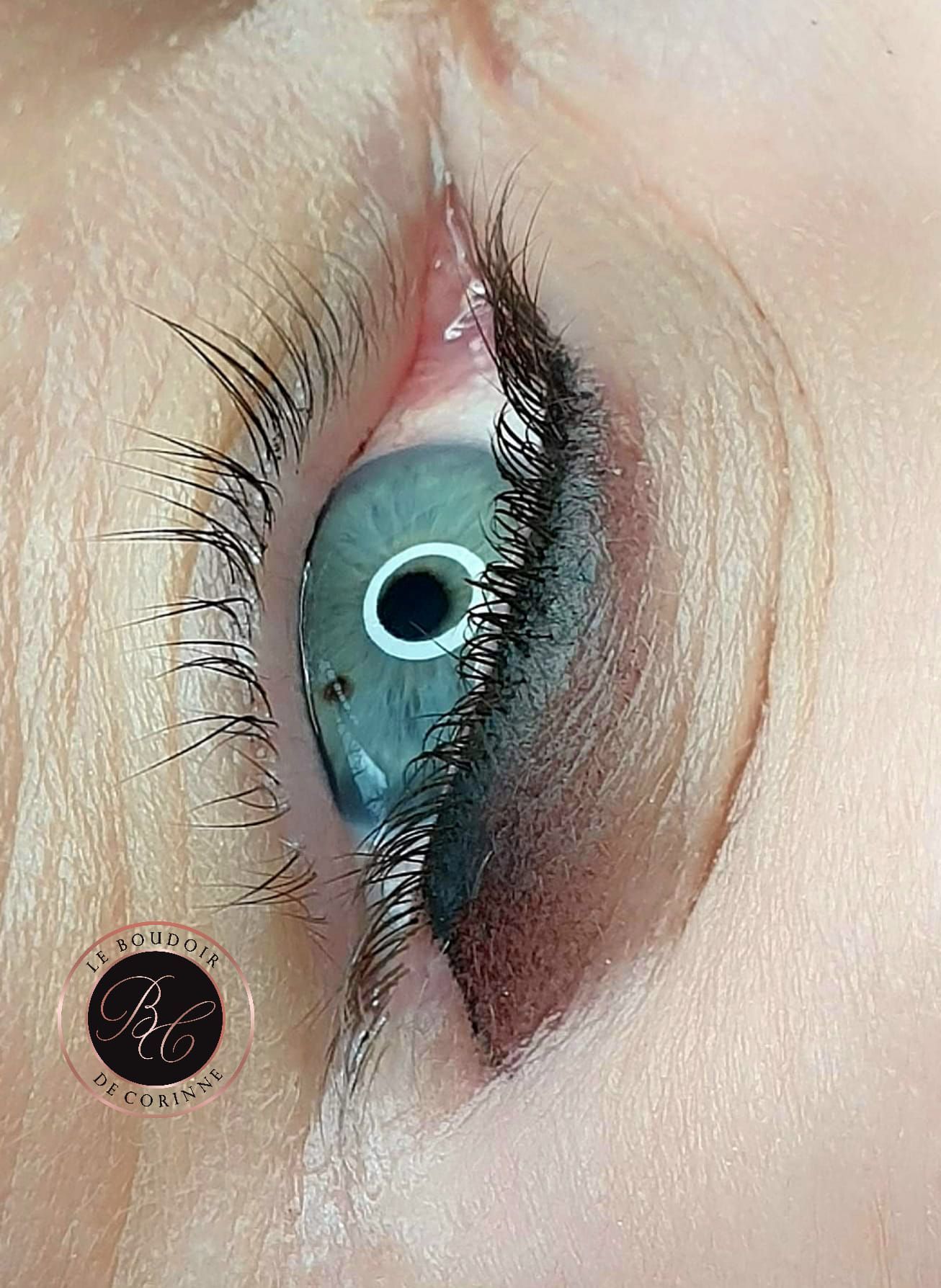 Ceci vous permettra de prévisualiser le résultat final. Corinne appliquera les pigments petit à petit sur la paupière, au ras des cils, délicatement. À la fin de la prestation, vous aurez l'impression d'avoir des cils beaucoup plus fournis.